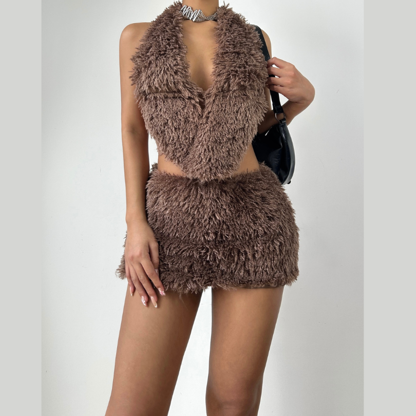 Fluffy backless tube mini skirt set | Festival Outfits Women