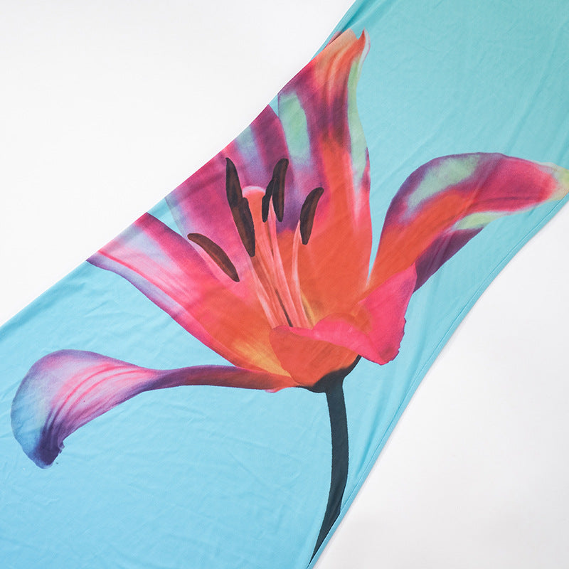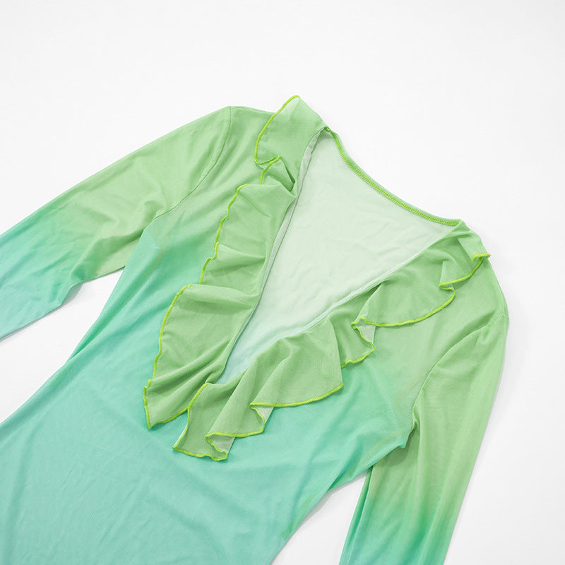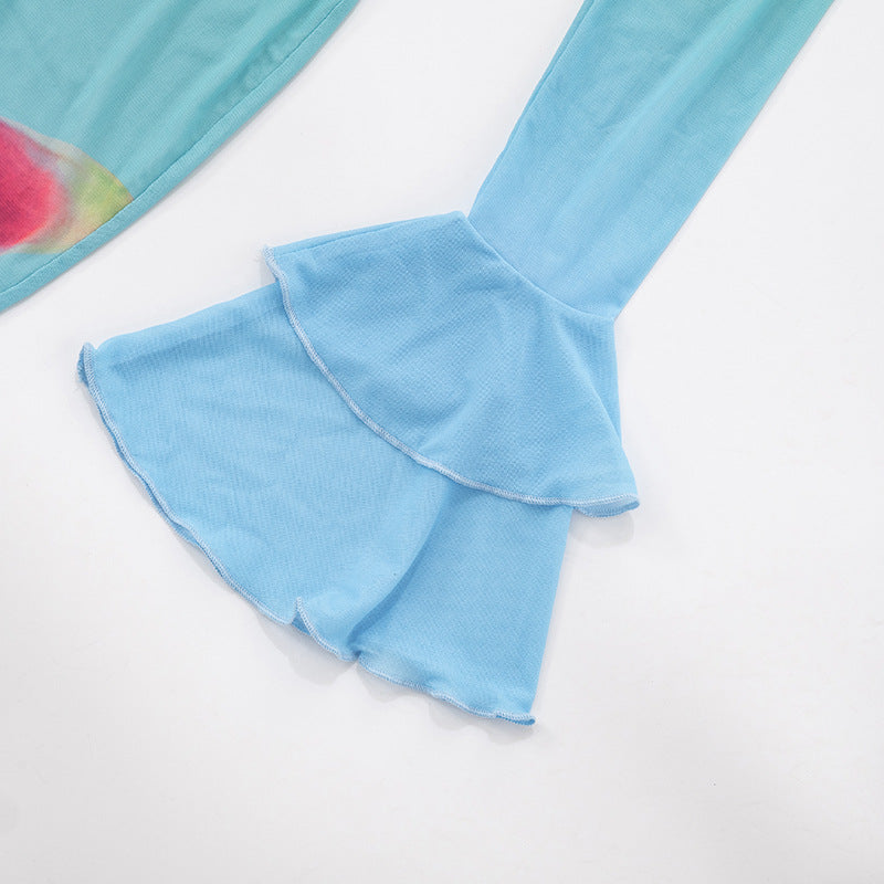Long flared sleeve v neck mesh flower print ruffle maxi dress
