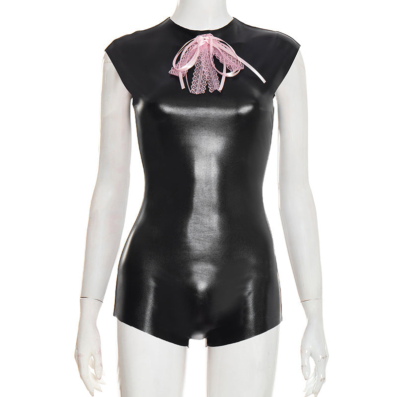 Crewneck bowknot zip-up sleeveless romper