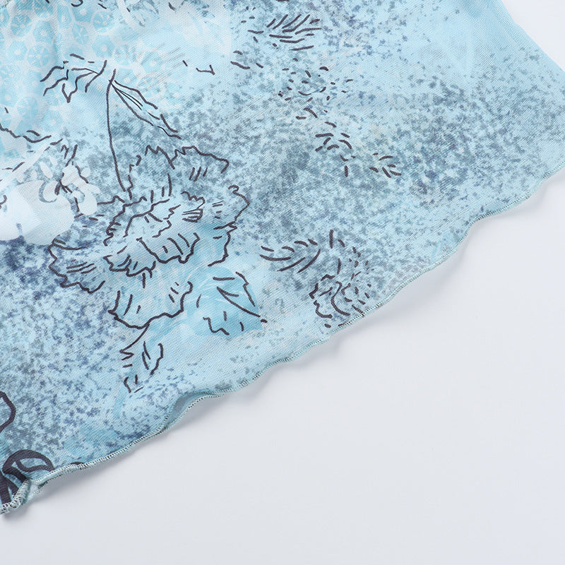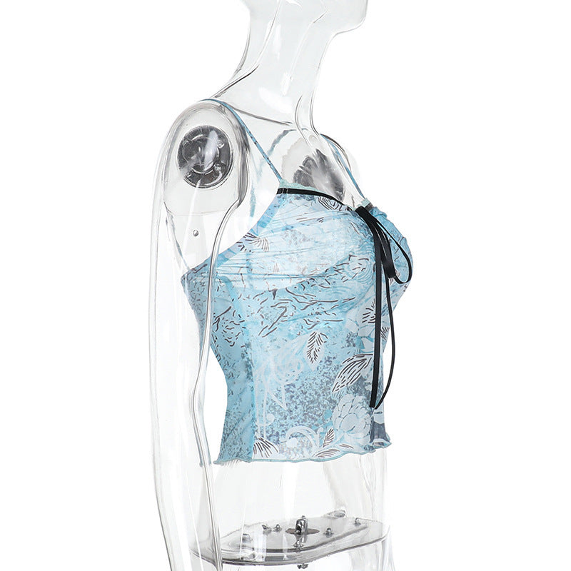 Lace hem self tie print mesh backless cami top