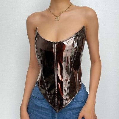 Halter PU leather zip-up backless v neck corset crop top
