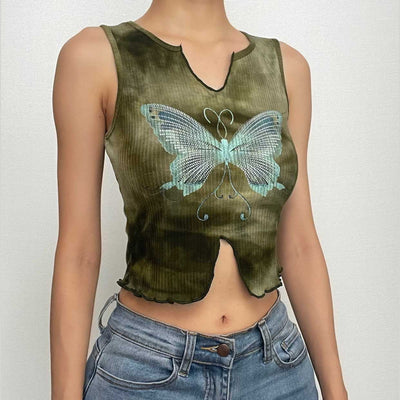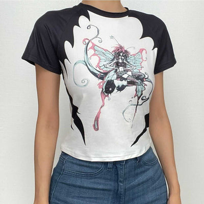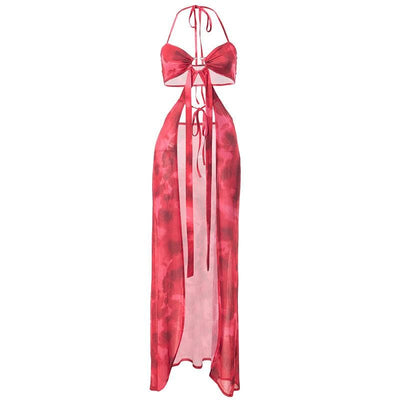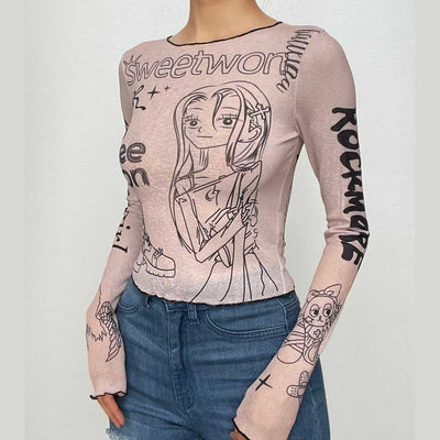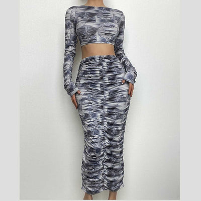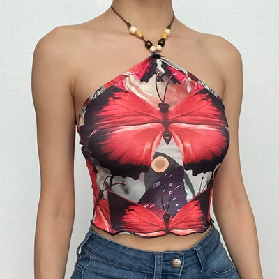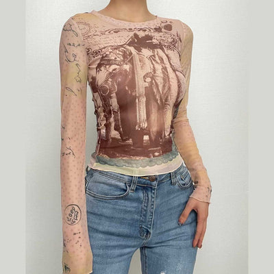 Sheer mesh see through flared sleeve contrast print 2-way top