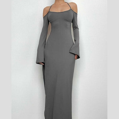 Metallic cowl neck ruched halter backless maxi dress