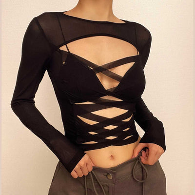 Flared sleeve o ring sheer mesh lace up shrug high neck top
