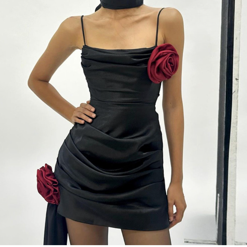 Square neck flower applique ruched mini dress