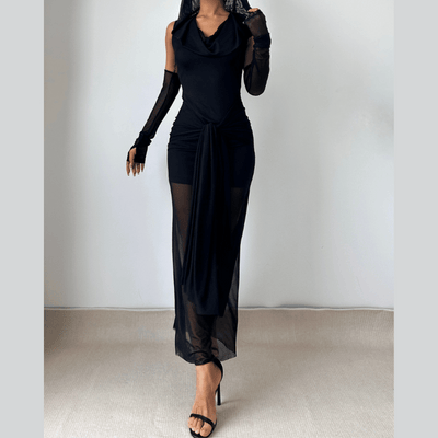 Mesh hoodie cowl neck ruched maxi dress