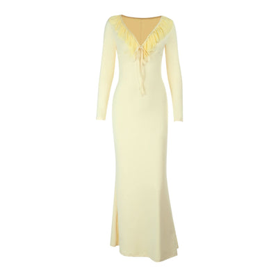 Ruffle v neck self tie long sleeve maxi dress