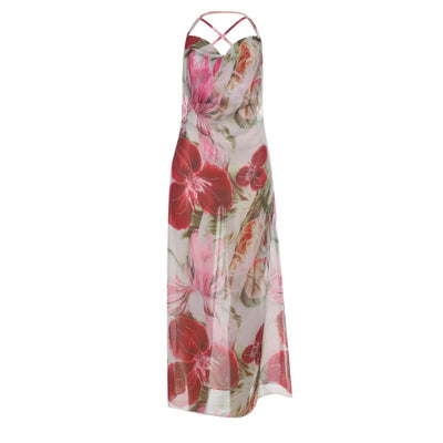 Cowl neck flower print slit self tie maxi dress