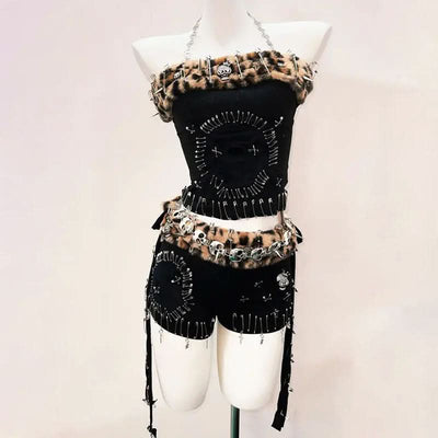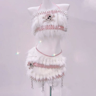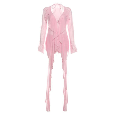 Mesh long sleeve v neck ruffle self tie mini skirt set