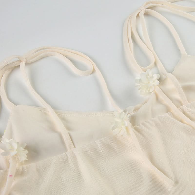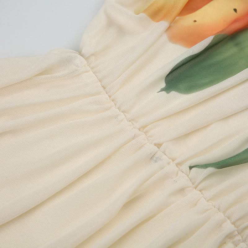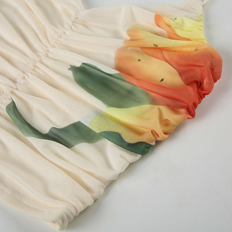 Ruched v neck mesh print self tie cami top