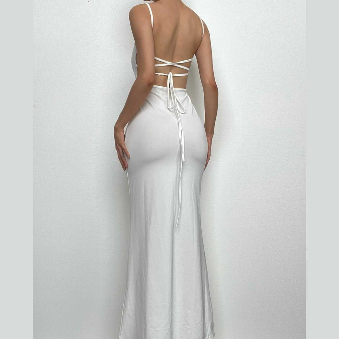 Backless hollow out low cut self tie solid cami cut out maxi dress
