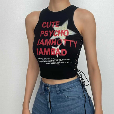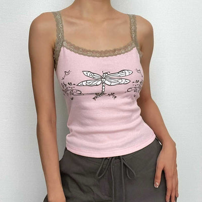 Lace hem butterfly pattern contrast sleeveless ribbed crop top