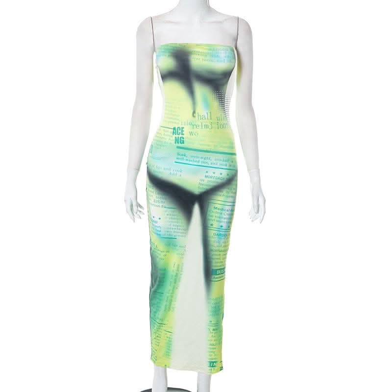 Letter print contrast slit backless sleeveless tube maxi dress-final-sale