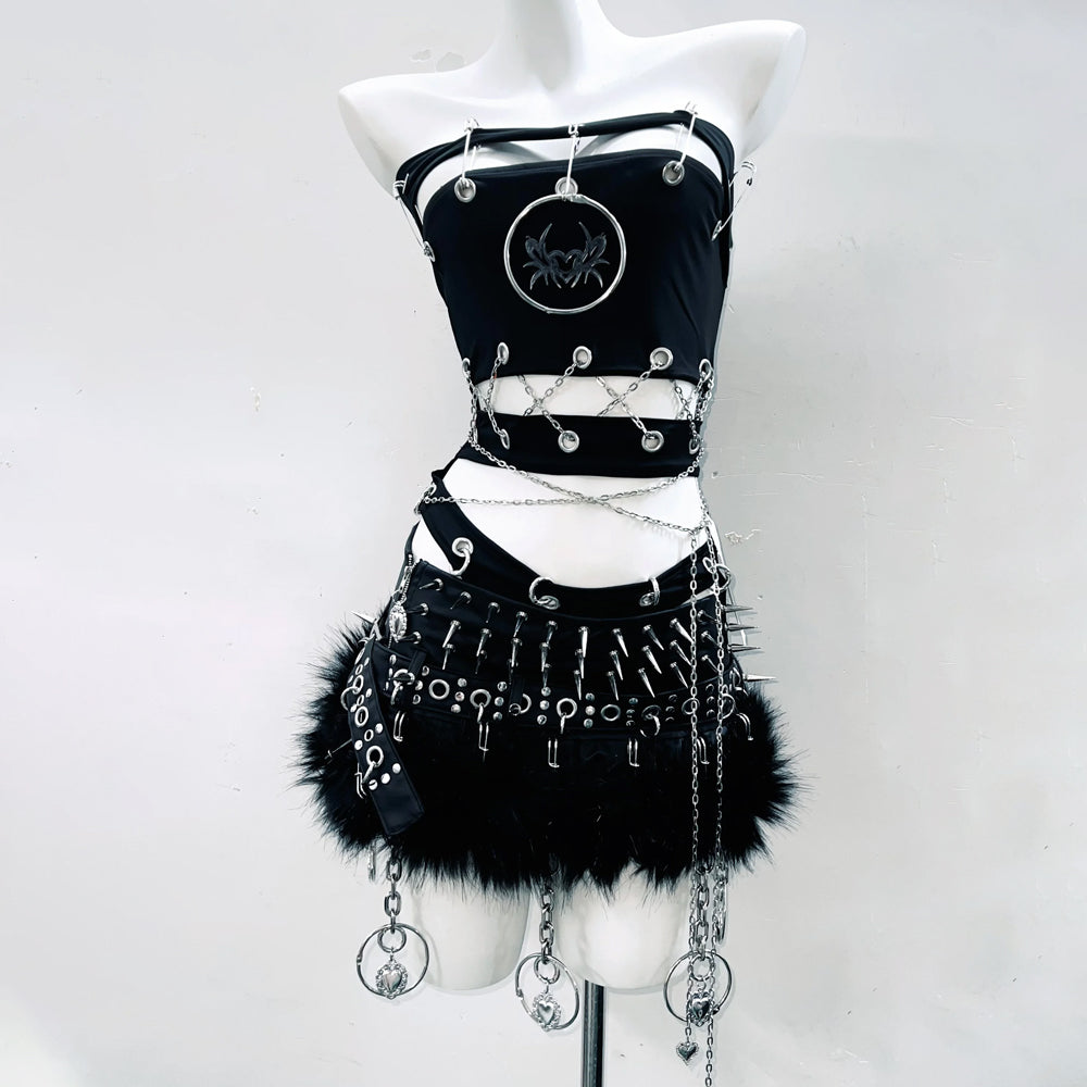 Hollow out metal chain o ring backless tube bodysuit
