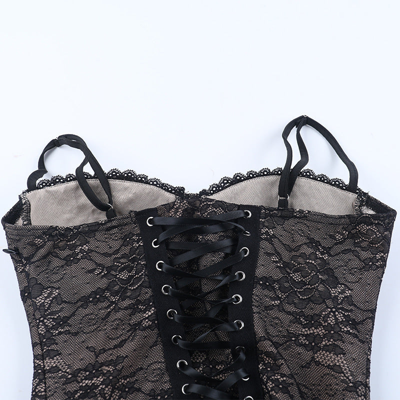Lace up v neck lace backless cami mini dress