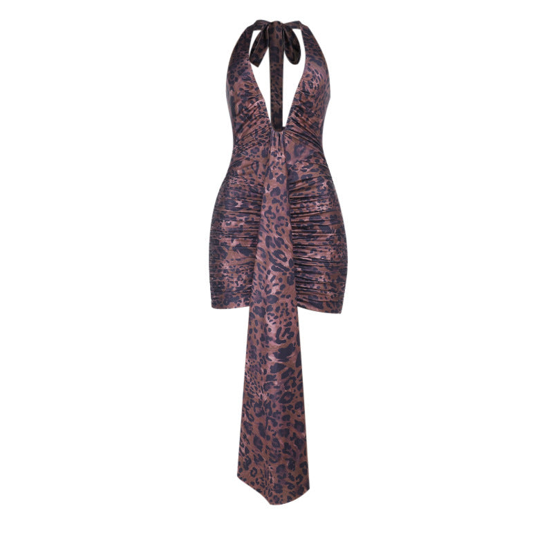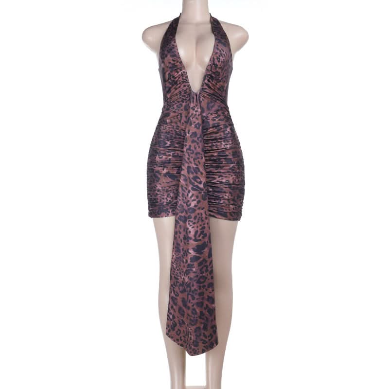 Leopard print v neck ruched halter self tie mini dress | Festival Outfits Women | Leopard Print Mini Dress