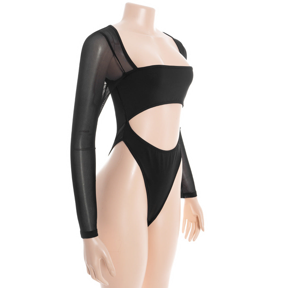 Mesh long sleeve button square neck hollow out bodysuit | Festival Outfits Women