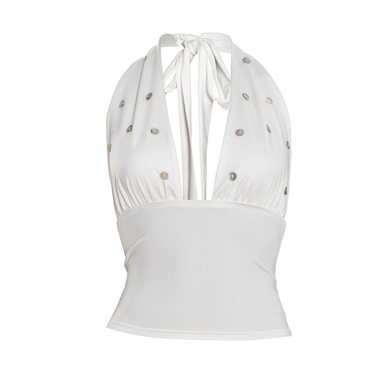 Self tie halter button applique backless top