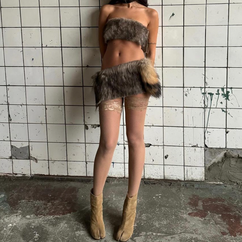 Fluffy backless contrast tube mini skirt set | Festival Outfits Women