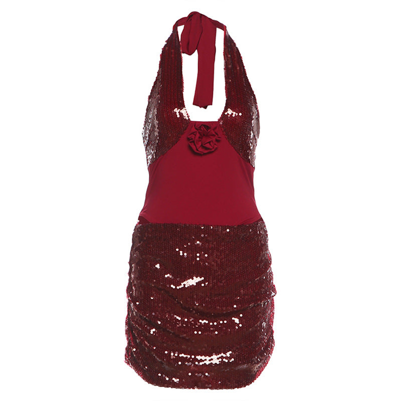 Glitter flower applique halter self tie mini skirt set | Festival Outfits Women