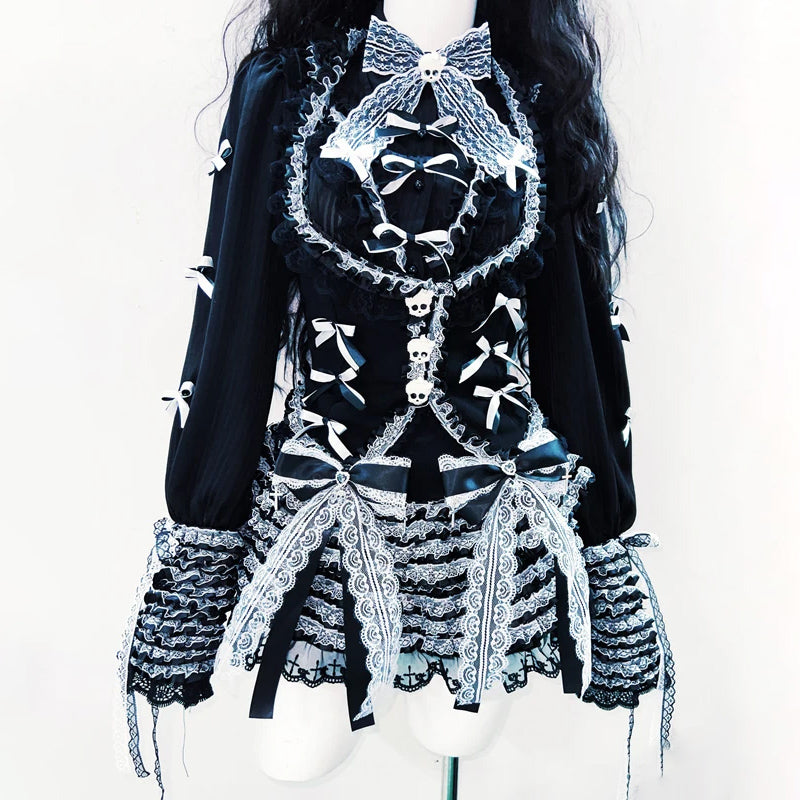 Bowknot long sleeve lace hem mini skirt set | Festival Outfits Women