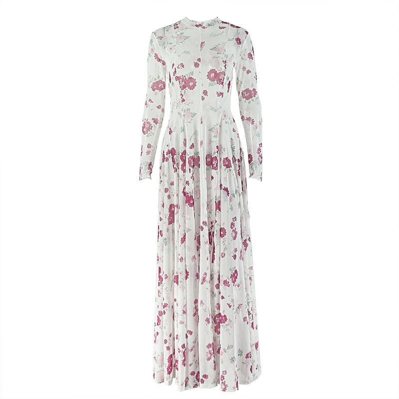 Long sleeve crewneck flower print mesh maxi dress | Festival Outfits Women