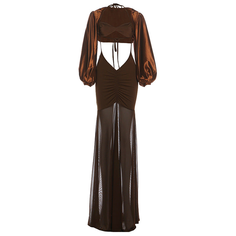 High neck long sleeve mesh solid maxi dress | Festival Outfits Women