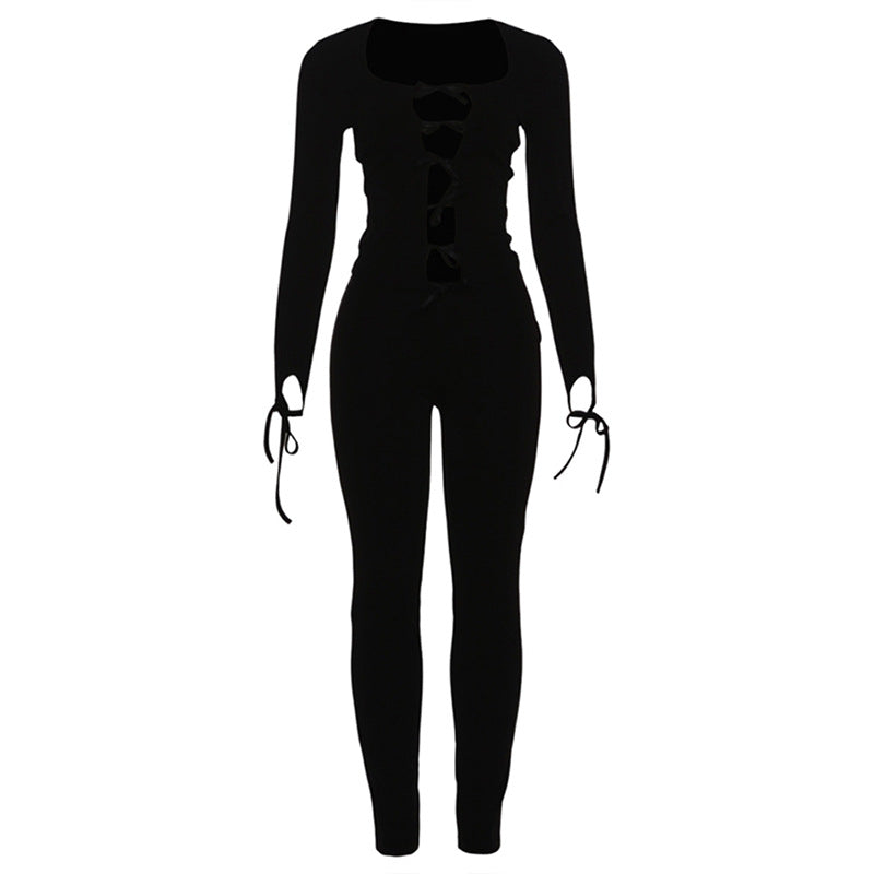 Long sleeve hollow out bowknot self tie pant set | Festival Outfits Women