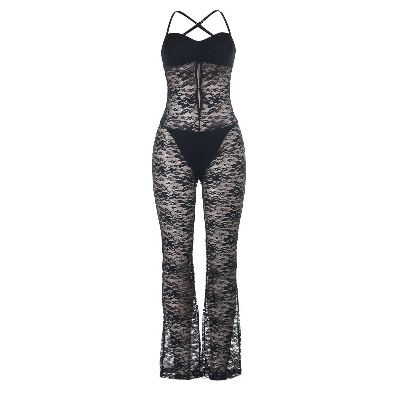Lace hollow out cross back solid jumpsuit | Festival Outfits Women