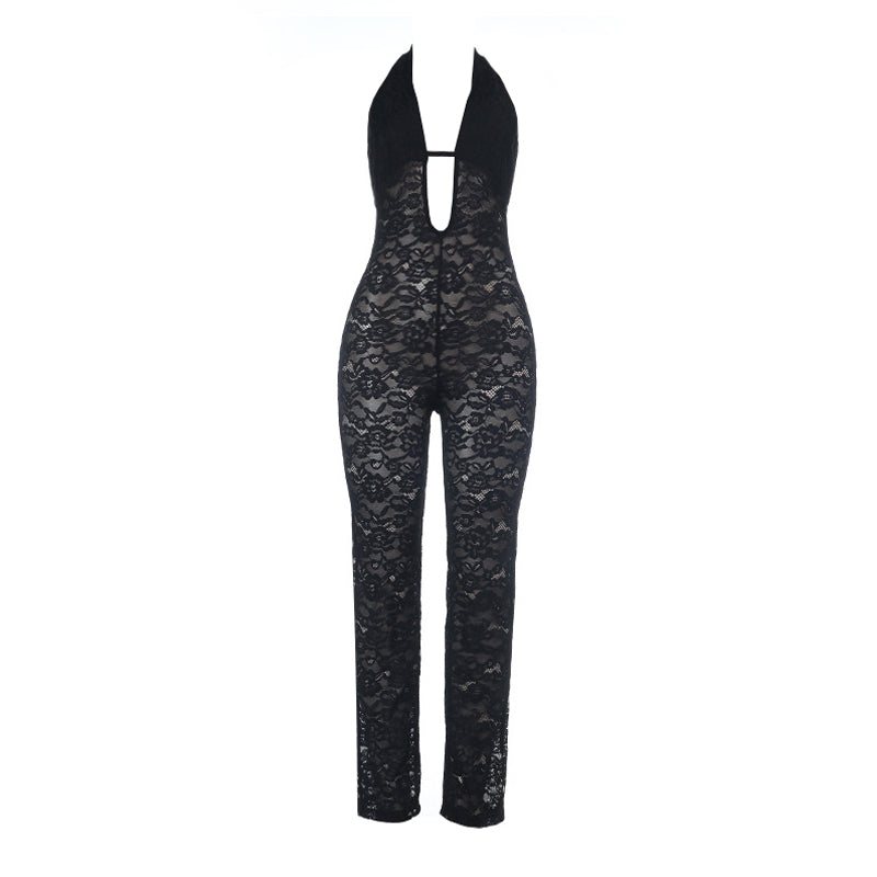 Hollow out lace halter self tie backless jumpsuit | Festival Outfits Women