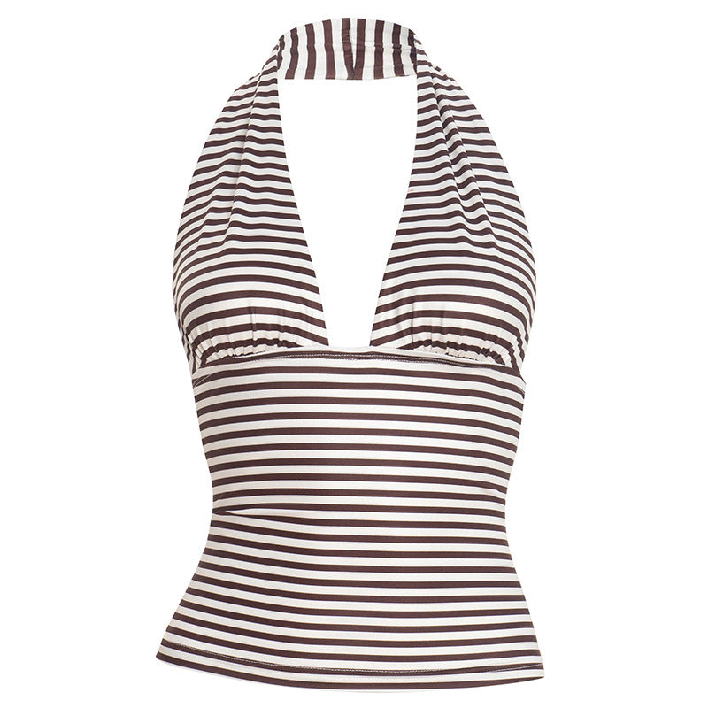 Halter self tie striped print backless v neck top | Festival Outfits Women