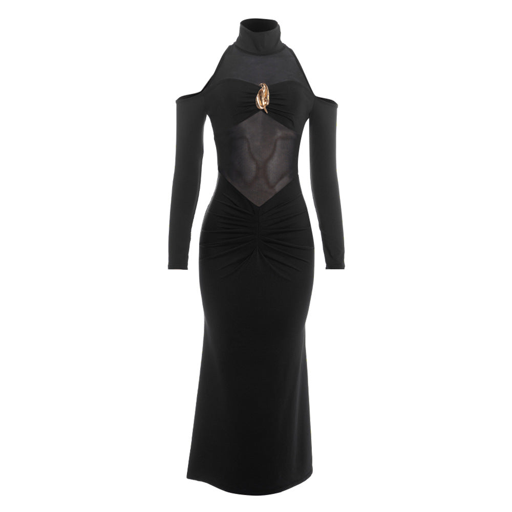 Long sleeve high neck hollow out mesh maxi dress | Festival Outfits Women