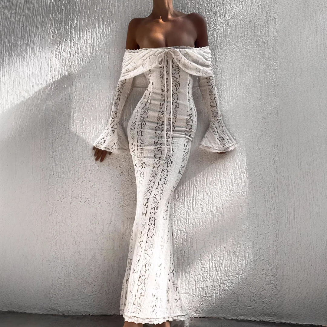 Long flared sleeve lace off shoulder self tie maxi dress | Festival Outfits Women