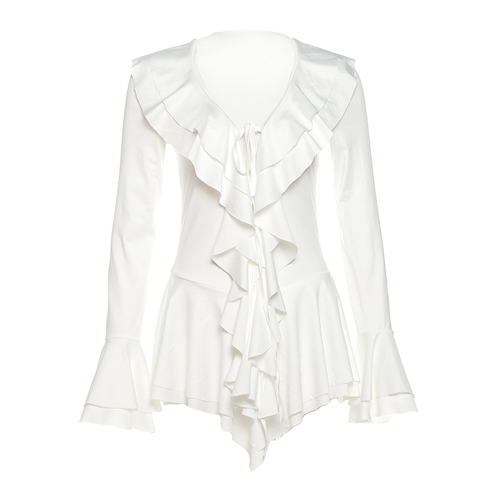 Long flared sleeve ruffle v neck self tie mini dress | Festival Outfits Women