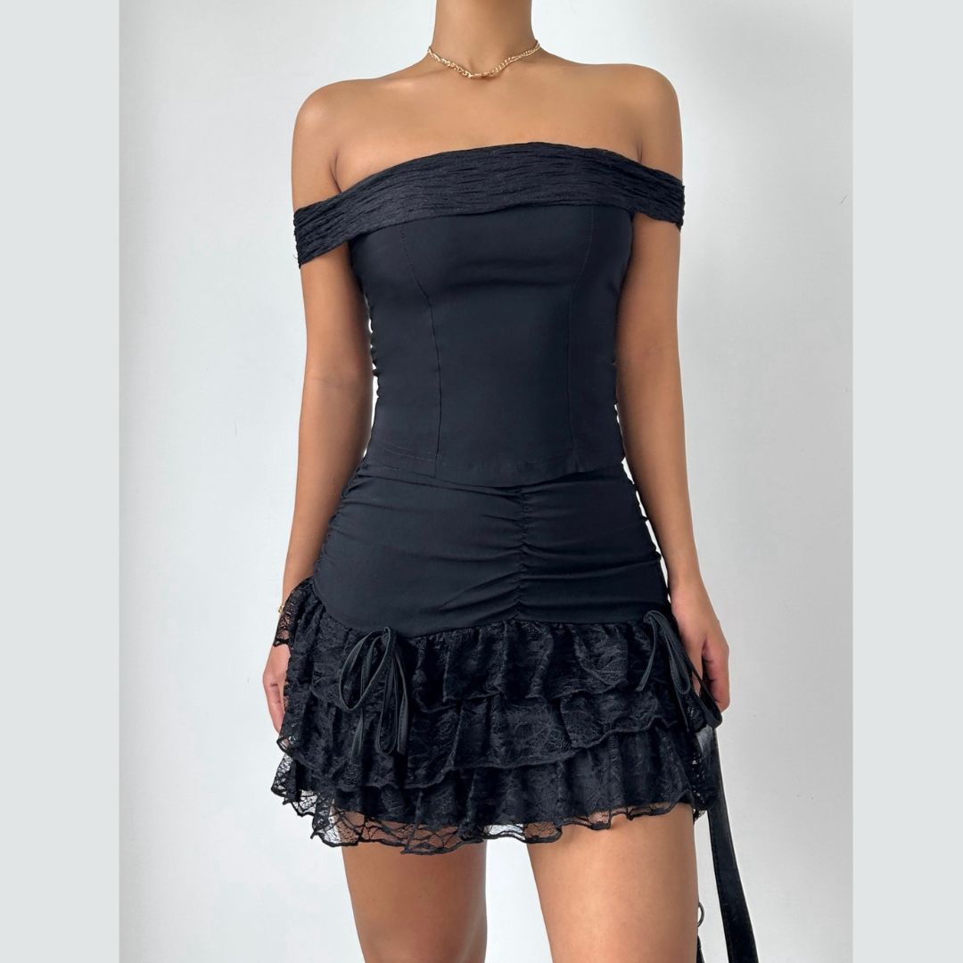 Off shoulder bowknot ruffle ruched mini skirt set
