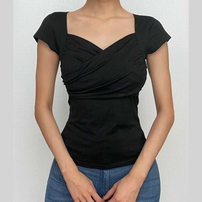 Short sleeve beaded cross pattern sheer mesh see through contrast top-final-sale