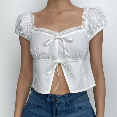 Lace patchwork contrast long sleeve self tie top-final-sale