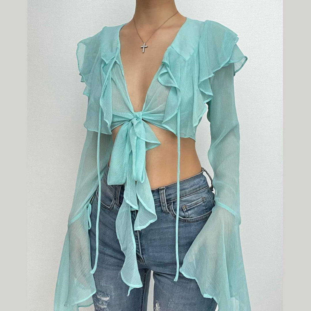 Solid long sleeve chiffon ribbon ruffle self tie crop top - Final Sale