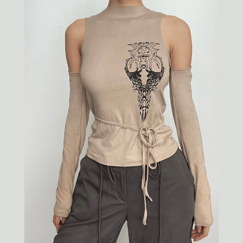 Abstract off shoulder long sleeve self tie contrast top-final-sale