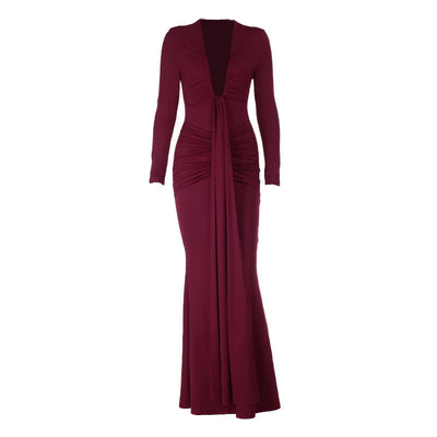 Long sleeve crewneck ruffle slit solid ruched maxi dress-final-sale