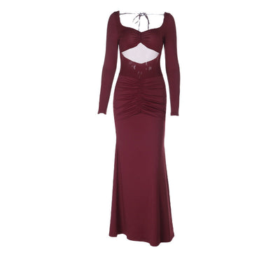 Long sleeve hollow out ruched mesh patchwork cut out maxi dress