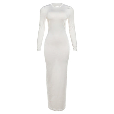 Self tie irregular long sleeve slit crewneck solid midi dress