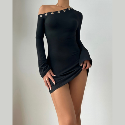 Long sleeve solid ruched o ring hollow out cut out mini dress