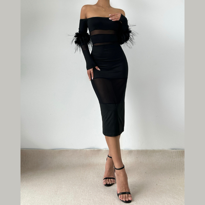 Off shoulder long sleeve fluffy mesh patchwork mini dress