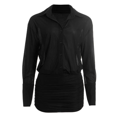 Cross front mesh ruched zip-up long sleeve solid mini dress