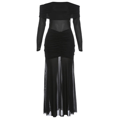 Off shoulder mesh patchwork long sleeve ruched maxi dress