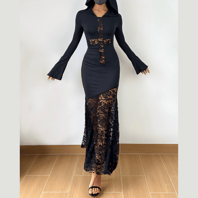 Long sleeve hoodie lace hem cross pattern maxi dress