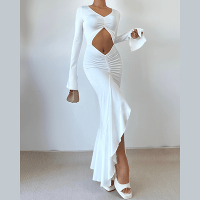 Long sleeve hollow out ruched v neck cut out maxi dress