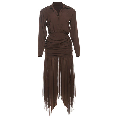 Turnover collar long sleeve ruched mesh maxi dress