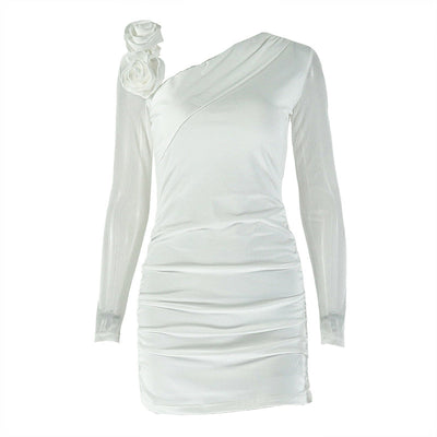 Long sleeve flower applique ruched mini dress